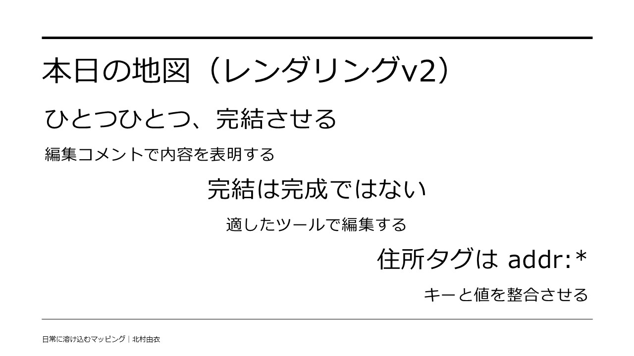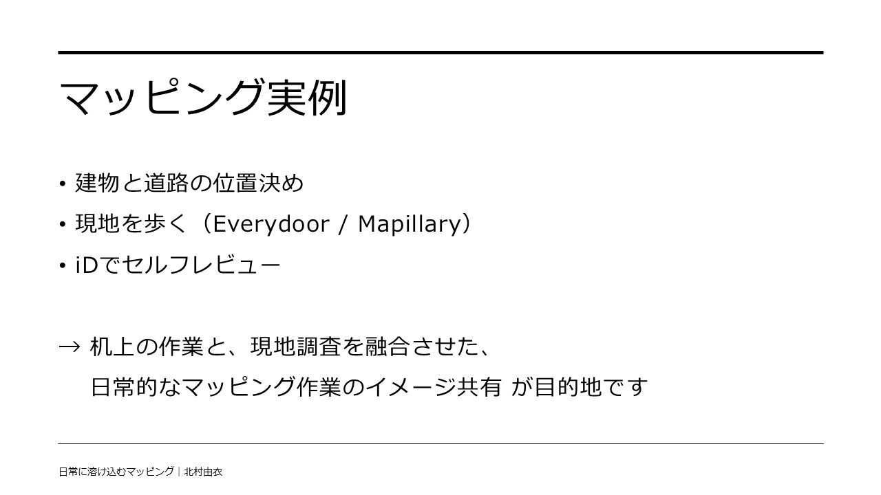 マッパーズサミットは、本年が初めての開催となる「OSMマッパーの集い」です。 私、北村由衣が発表タイトル「日常に溶け込むマッピング」として登壇し、30分間のお時間をいただき、発表と質疑応答をしました。